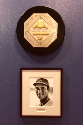 From there we entered the newly installed and impressive hall of trophies. One entire wall was lined with rows and rows of Golden Gloves. The other wall contained MVPs – Koufax, Gibson, Kershaw, et al – and two World Series trophies. The innumerable Dodger Rookies of the Year were also represented. Todd Hollandsworth, anyone?